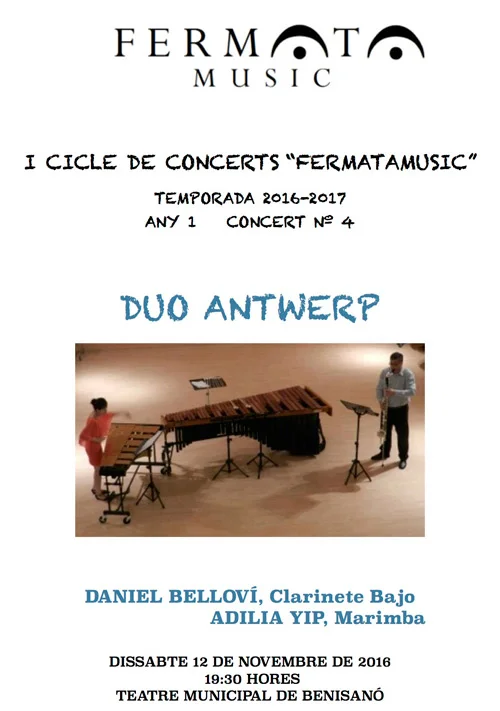 Tango (1890) de Isaac Albéniz (España) | Suite Popular Española (1914) de Manuel de Falla (España) | Tango Milonga (2015) de Josep Roda (España)* | Acuarelas españolas (2016) de Josep Roda (España)* | Asturias (1883) de Isaac Albéniz (España) (Marimba Solo) Arr. Adilia YIP | Belchite (2012) de Manuel Morcillo (España) (Bass Clarinet Solo)*** | Ballade (2014) de José Alamá (España)* | ClarimBass (2015) de Juan Bautista Meseguer (España)* | Duende (2015) de Eduardo Nogueroles (España)* | The Spanish Dream (2014) de Pere Sanz (España)*